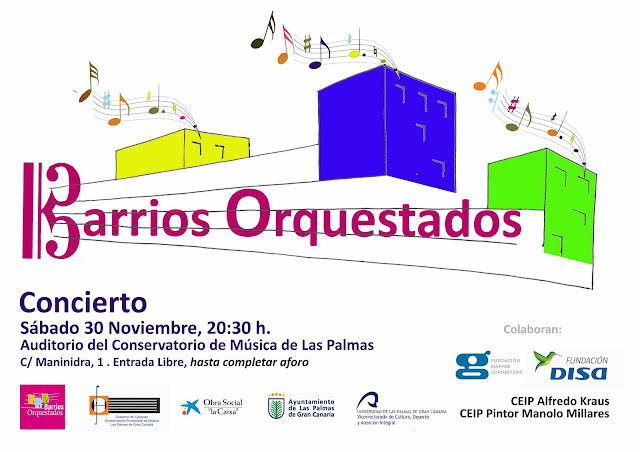 Por otro lado, mañana, sábado 30 de noviembre, en el Conservatorio Profesional de Música de Las Palmas (Calle Maninidra) tendremos el gran concierto exclusivo de Barrios Orquestados con entrada gratuita y libre hasta completar aforo. El aforo del Auditorio del Conservatorio Profesional de Música de Las Palmas es de 440 plazas. Las puertas se abrirán a las 20:00 horas.